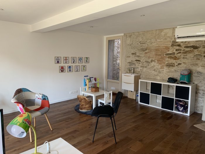 Dans une maison en pierre entièrement rénovée, je propose un cabinet de 28 m² aménagé, chaleureux et lumineux, avec parquet bois et murs en pierre apparente.Le cabinet se situe au sein d’un espace pluridisciplinaire (éducatrice spécialisée, esthéticienne, thérapeutes).Je suis moi même sophrologue.